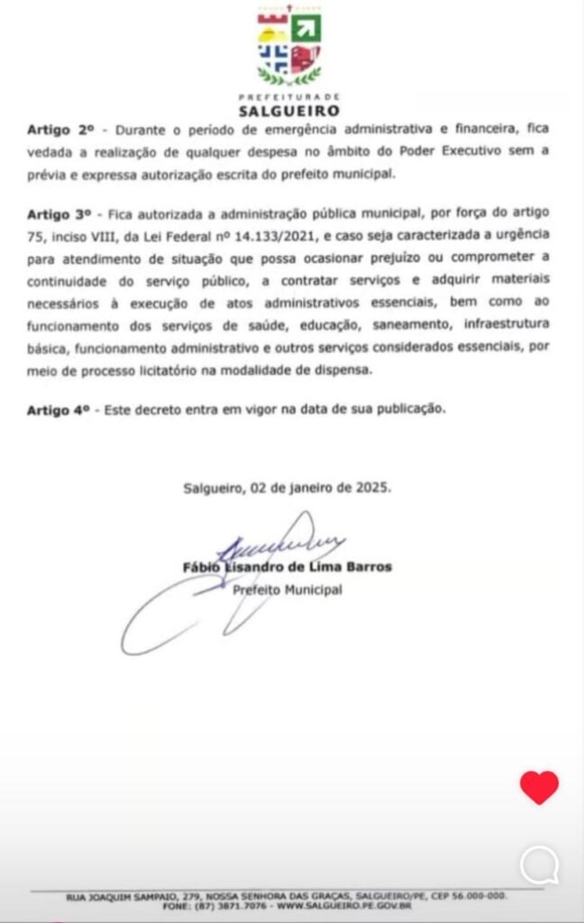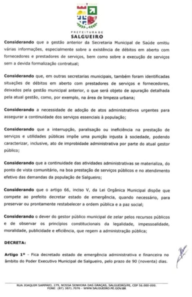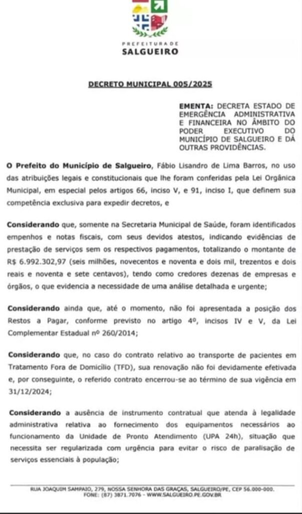 O novo prefeito de Salgueiro, Fabinho Lisandro, tomou uma medida drástica para enfrentar uma grave crise financeira e administrativa no município. Por meio de um decreto, foi instaurado o estado de emergência,  justificando-se pela situação caótica das finanças públicas e pela precariedade dos serviços essenciais, herança deixada pela gestão do ex-prefeito Dr. Marcones.